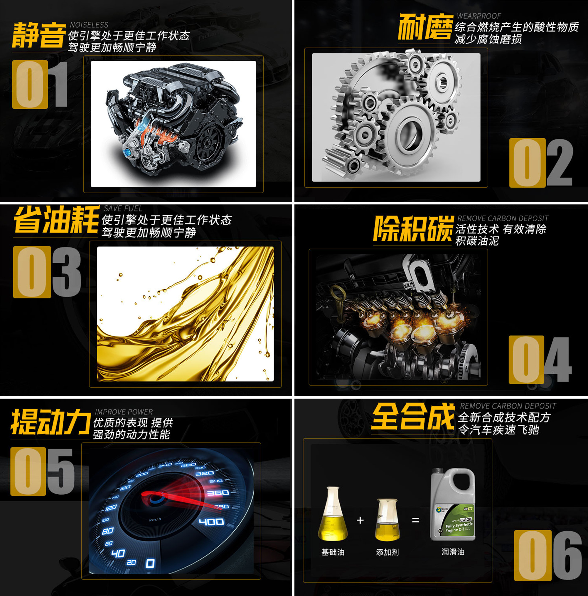 •卓越的全合成机油,油品具有超强氧化稳定性,保证发动机在高温高速下运转顺畅